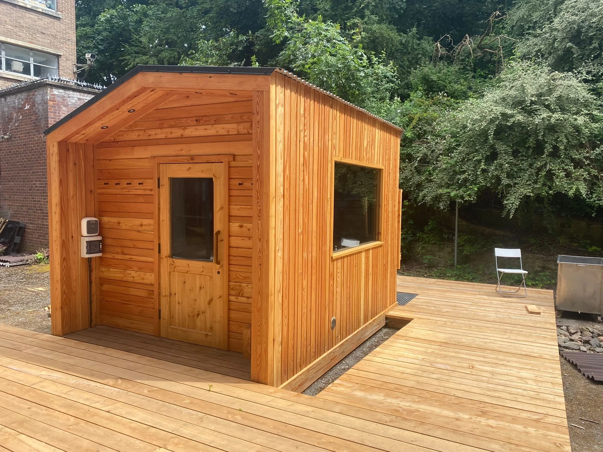 Accessible to all, the Saltbox Sauna comes with a bespoke, handmade, glazed door secured with a 5 point mortice lock. Clad in planed local larch with natural rot resistant properties which can be stained a number of colours on request. The hot room is clad in luxurious knot Radiata pine with no visible fixings with benches made from thermo Spruce for optimum durability throughout heavy use.
